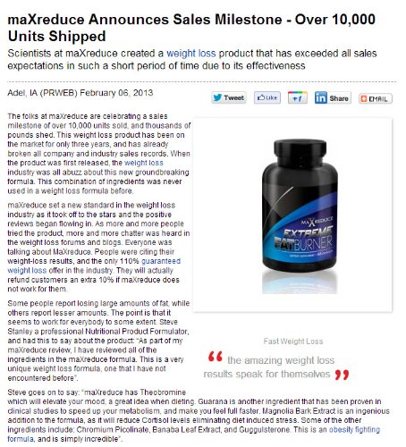 -. Binding : Health and Beauty -. Brand : maXreduce -. EAN : 0610585935460 -. Feature : ZAP OUT APPETITE & LOSE WEIGHT QUICKLY OR GET A REFUND! -You're looking at the premier weight loss supplement on Amazon. If you don't see results with maXreduce...we'll give you a full refund. This isn't hype -it flat out works & we'll prove it! / LONG-LASTING ENERGY BOOST WITHOUT THE JITTERS OR CRASH! -If you need to lose weight quickly and can handle a powerful product...this is made for you. If you don't want quick weight loss or increased energy, please do not use maXreduce. / HIGHLY CONCENTRATED DIET PILL FORMULA, RESULTS THAT LAST! -Just 2 easy diet pills daily to start living the way YOU want to with a body you can be proud of. As some of our users say, you'll have to remind yourself to eat because your appetite for goodies is GONE! / AREN'T YOU READY TO GET YOUR BODY BACK? -For less than the cost of a night out, you can finally make that change in your life. What's your goal? Imagine reaching that goal...how would that feel? It's time. maXreduce is your secret weapon. / "Empty Bottle Guarantee" Use the Whole Bottle and If You Are Not Satisfied Simply Contact Us For a Full Refund - Nothing to Return! -. IsAdultProduct : 0 -. Label : Advanta Supplements -. Manufacturer : Advanta Supplements -. Model : LA-AM-B004X6HLH2 -. MPN : LA-AM-B004X6HLH2 -. PackageQuantity : 1 -. PartNumber : LA-AM-B004X6HLH2 -. ProductGroup : Health and Beauty -. ProductTypeName : HEALTH_PERSONAL_CARE -. Publisher : Advanta Supplements -. Studio : Advanta Supplements -. Title : maXreduce - Extreme Fat Burner Guaranteed Weight Loss -. UPC : 610585935460