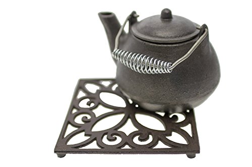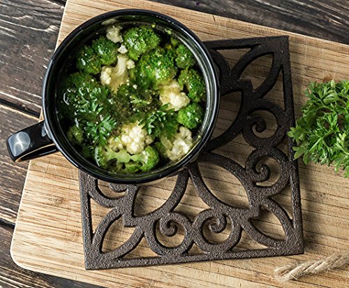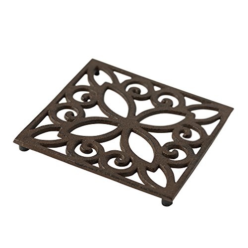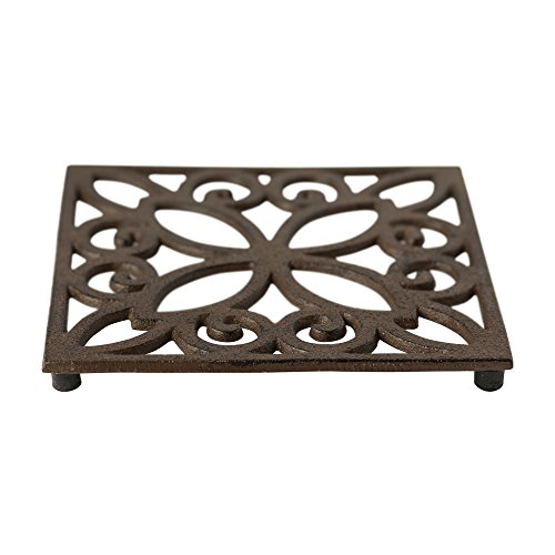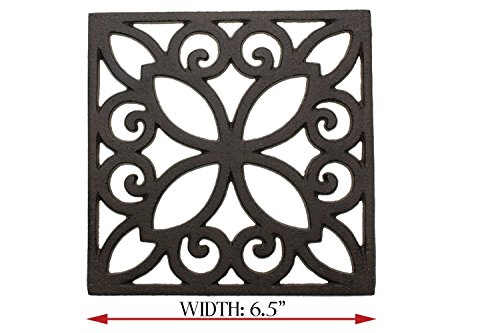 - CONVENIENT AND EASY TO USE - Attractive design of this item does not make it only a decorative piece. It is easy to use and will be a beautiful addition to any kitchen or dining room. Thick, rounded edges will not damage your surfaces. This trivet comes with rubber feet for extra protection. Compliment this trivet with our selection of other cast iron décor items. This trivet measured 6.5 x 6.5".