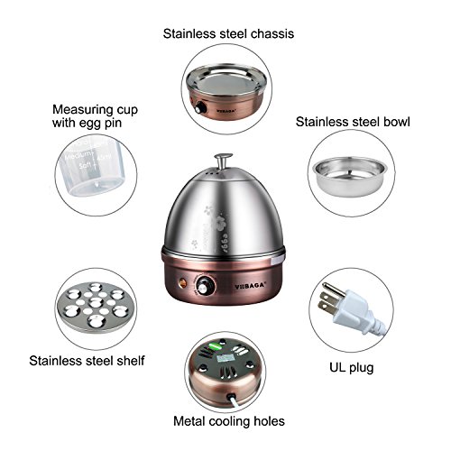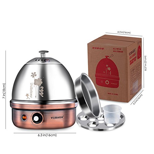 Prepare?The?Most?Delicious?Eggs?Ever??Make?Everyone?Wonder!? Now?you?don't?have?to?... ...?wait?for?the?water?to?boil.? ...?fill?pans?and?pots?with?water. ...?watch?the?clock?all?the?time.? You?have?just?found?the?coolest?egg?boiler?cooker?device?that?will?do?all?the?work?for?you.?Save?your?precious?time?and?get?yourself?a?VOBAGA?electric?egg?poacher.? Load?With?Eggs,?Fill?With?Water,?Wait??Enjoy?-?Precise?Egg?Boiling?Has?Never?Been?That?Easy?Before!? With?just?3?moves?and?a?little?bit?of?your?time,?you?can?prepare?the?most?delicious?eggs?ever.? Load?the?stainless?steel?rack?tray?with?up?to?7?eggs,?fill?the?basket?with?water,?plug?and?let?the?cooker?do?the?rest.?Piece?of?cake,?right? This?electric?egg?cooker?uses?auto circulation insulation mechanism to make you can enjoy the delicious eggs,also can save energy, protect?and?even?prevent?accidents.?As?soon?as?your?eggs?are?cooked,?the?egg?poacher?will?let?you?know?that?is?time?to?remove?them. Each?package?includes?several?accessories?to?aid?the?egg?cooking?procedure.?Open?it?and?find?a?measuring?cup,?an?egg?poaching?bowl and?a?stainless?steel?rack.? The?measuring?cup?features?markings?for?varying?degrees?of?doneness?and?the?poaching?tray?holds?up?to?7?eggs?all?at?once.?Take?it?off?the?heated?cooker?and?place?it?under?cold?water?to?speed?up?the?cooling?process.? Please?notice:?egg?holder?and?the?lip?can?be?cleaned?in?the?water;?But?base?tray?and?the?base?can?NOT?wash?in?the?water,?you?just?can?scrub?it?with?wet?towel. With?A?VOBAGA?Egg?Cooker?You?Could?...? ·?...?boil?soft,?medium?and?hard?eggs.? ·?...?prepare?tasty?omelettes.? ·?...?make?delicious?scrambled?eggs.? ·?...?try?eggs?Benedict?or?poached. ·?...?even?heat?up?food?on?the?rack.?
