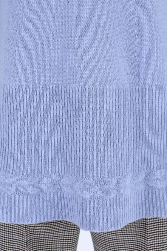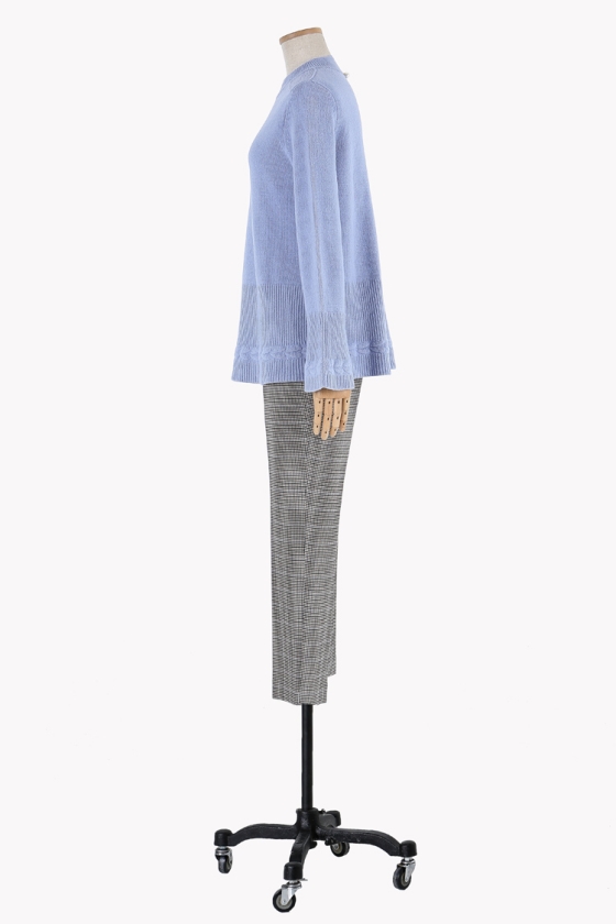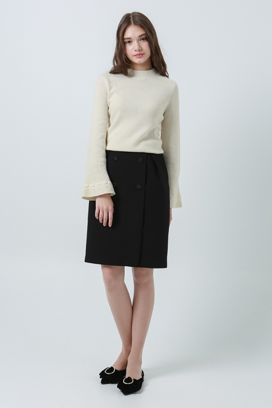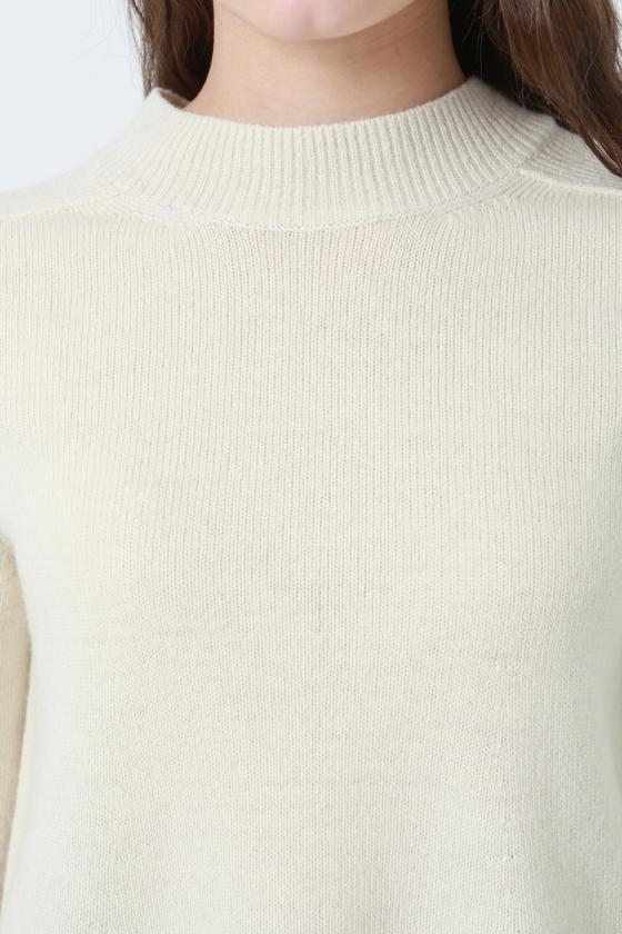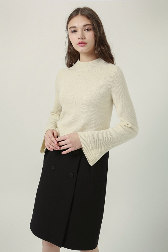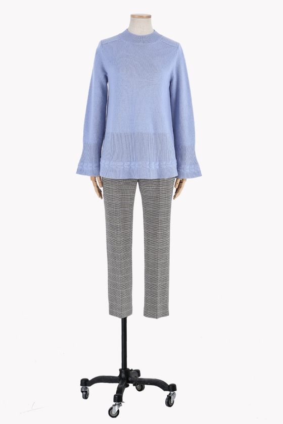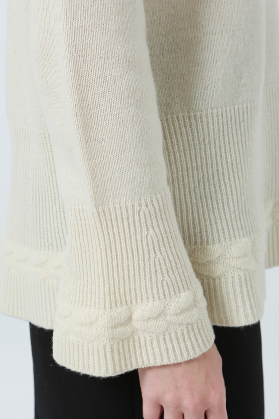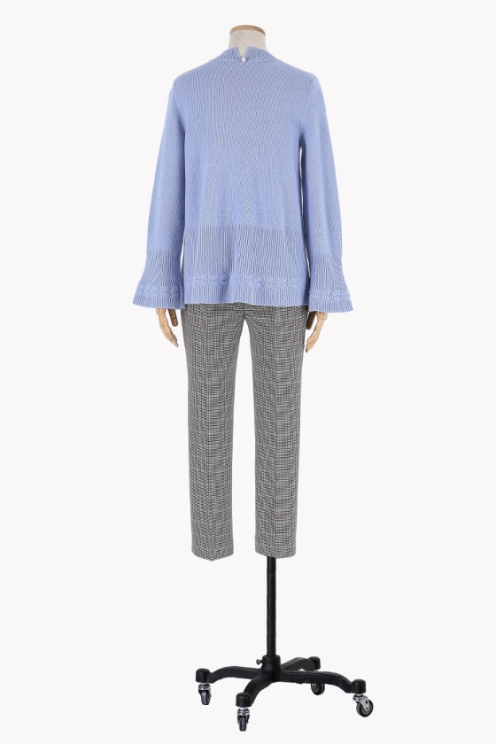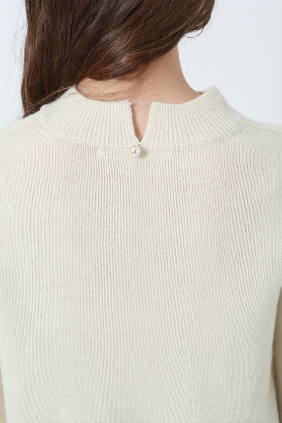 소매와 밑단의 조직 변형감이 돋보이는 벨소매 니트 풀오버 입니다.뒷면 네크라인에 트임과 진주장식으로 포인트를 주었습니다.여유있는 기장감으로 편안하게 착용 가능합니다.