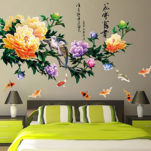 -. Title : Amaonm Giant Huge Peony Flowers Removable DIY Tree Branches Green Leaves and Birds Fish Lettering Wall Decals Stickers Murals Decor for Living room Bedroom Study Home Wall Background