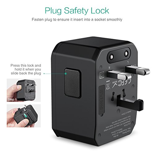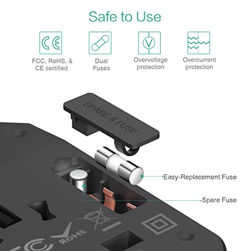 4. SAFETY PROTECTION: Built-in smart IC, plug lock and safety shutters to protect you and your devices from over-voltage and over-current during charging. It's FCC, CE, and RoHS certified with dual 8A fuse in small compartment beside the plug, one of them is for back-up replacement.