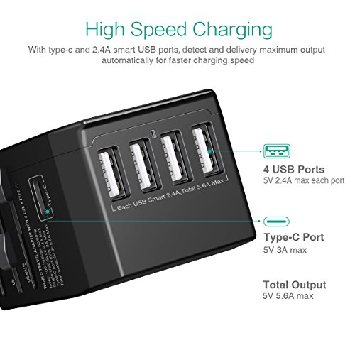 2. SMART USB PORT FOR FAST CHARGING: With wide range input, Max. 5.6A 100-240V AC. Smart single USB port: Max Output 2.4A, 5V DC, USB Type-C port charger: Max Output 3.0A, 5V DC. Total power is up to 28W. Intelligent charging for 5 devices simultaneously.