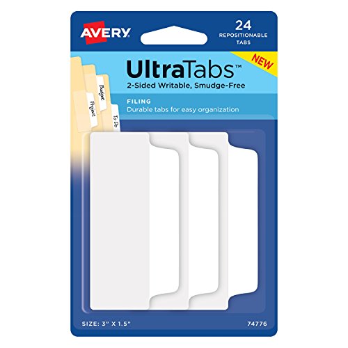 Avery Filing Ultra Tabs, 3" x 1-1/2",Two-Side Writable Tabs, White, Pack of 24 Repositionable (74776)