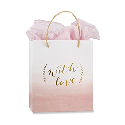 - White gift bag with bottom pink watercolor design. A leafy design graces the bag with a gold foil ""with love"" message and Kraft material handles.