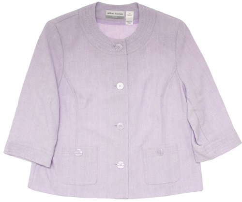 Alfred Dunner Provence jacket features a 3/4 sleeve, button down front, front pockets and is 100% polyester.