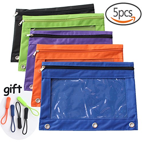 ZIPPERED BINDER PENCIL POUCH WITH ZIPPER PULLS, PENCIL CASE WITH 3 RIVET ENFORCED HOLES, 5 PACK 5 COLORS