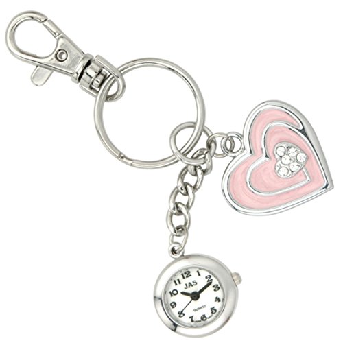 JAS Unisex Novelty Belt Fob/Keychain Watch Pink Heart Silver Tone