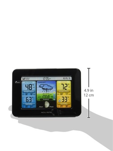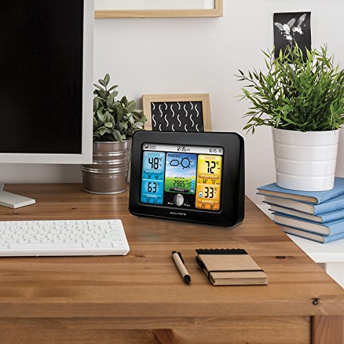 When heading out for the day; it's nice to see a dependable weather forecast at-a-glance so you can dress appropriately; pack an umbrella for afternoon showers; or plan to leave work early to avoid driving in a Snowstorm. The AcuRite color weather station with temperature; humidity and forecast is an excellent choice among leading color weather Stations for home use. Features include a wireless temperature and humidity sensor and an illuminated color LCD screen display. Weather station information includes indoor and outdoor temperature and humidity; weather forecast; an indoor humidity level indicator; moon phase; and barometric pressure with weather trend Arrow. The color display features adjustable brightness and an auto-dimming setting that adjusts backlight brightness based on time of day. Patented Self-Calibrating technology provides an accurate; personalized forecast of 12 to 24 hour weather conditions. The built-in Intelli-Time clock adds unprecedented convenience because it's pre-programmed with the correct time and date and automatically updates itself for daylight Saving time. The outdoor sensor features powerful wireless technology; weather-resistant construction and an integrated hanger for easy mounting. The color weather station display stands upright for tabletop use or is wall-mountable. It's the best weather station for people that want an attractive design and reliable weather information to confidently plan for the day ahead. Limited one-year warranty. It's more than accurate; it's AcuRite.Feature