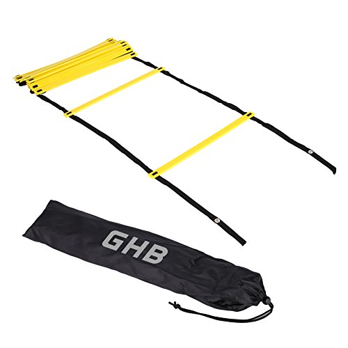 -. Binding : Misc. -. Brand : GHB -. EAN : 0751570407293 -. Feature : 12 Durable plastic rungs, overall length: 20 feet / Each rung measuring 17" long, space between rungs measuring 15" / Equipped with a carry bag for easy portability / Great tool for you to improve quickness through accelerated foot strike and lift frequency. / Great tool for weight loss as it can TORCH CALORIES bigtime. -. IsAutographed : 0 -. IsMemorabilia : 0 -. Label : Smile&Satisfaction -. Manufacturer : Smile&Satisfaction -. MPN : AL -. PartNumber : AL -. ProductGroup : Sports -. ProductTypeName : SPORTING_GOODS -. Publisher : Smile&Satisfaction -. Studio : Smile&Satisfaction -. Title : GHB Pro Agility Ladder Agility Training Ladder Speed Flat Rung with Carrying Bag 12 Rungs -. UPC : 751570407293