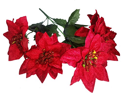 The rich, full, blooming heads of these gorgeous Poinsettias make them a stunning choice for your holiday decorating! They're also perfect for floral arrangements, centerpieces, crafts, and more. Plus, flexible wired stems let you bend and shape to suit your needs. One bush 5 stems. Total Length 14in (stem + flower), Flower diam: 4.5 - 5.0 in approx.Feature