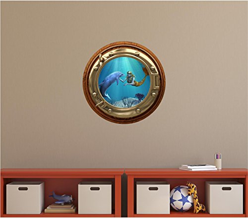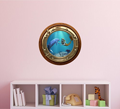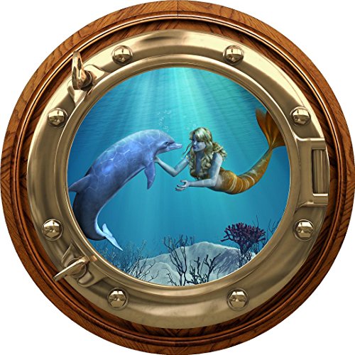 -. Binding : Kitchen -. Brand : Stickit Graphix -. Color : White -. Feature : Welcome to Stick-it Graphix! Our unique and colorful range of wall graphics, stickers and decals add life to any wall they are used on. With high quality graphics representing an exciting variety of categories like Cities, Nature/landscape, Cars, Space and even a little Fiction..you're sure to find the perfect graphic for your room! / Only the best vinyl & eco-sol ink used. / Easy to install...just peel & stick! / Made in USA. / View all the wall graphics by clicking on our name @ the top of the page -. IsAutographed : 0 -. Label : Stickit Graphix -. Manufacturer : Stickit Graphix -. PackageQuantity : 1 -. ProductGroup : Home -. ProductTypeName : HOME -. Publisher : Stickit Graphix -. Studio : Stickit Graphix -. Title : 12" PortScape DECAL! MERMAID w/ DOLPHIN #1 BRASS WOOD Instant Sea Window View Porthole Wall Vinyl Decal Sticker Home Childrens Kids Game Room Mural Decor