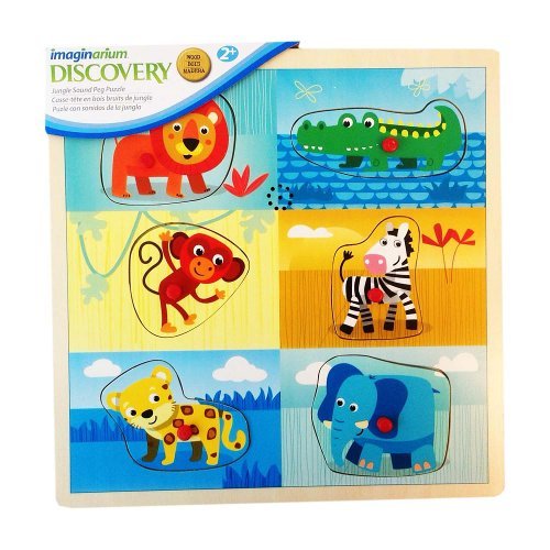 Studio : Toys R Us Publisher : Toys R Us Binding : Toy Product Description Lift the colorful wooden peg pieces of the Imaginarium 6-Piece Baby Animals Sound Peg Puzzle - Jungle to hear the fun, realistic sounds of jungle animals! This 6 piece puzzle features jungle friends in their natural habitats including a lion, monkey, cheetah, crocodile, zebra and elephant. 2 AA batteries required and included. Ages 2 and up. 0