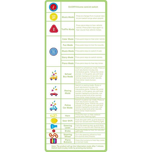 -. Feature : INTERACTIVE LIGHTS & MUSIC: The steering wheel has simple kid friendly buttons and controls for maximum fun! Piano keys, vehicle sound simulators and controls along with the fun flashing lights make it an enthralling package for any child! / DRIVING FUN: This steering wheel simulator has everything your child needs to feel like they are really driving! With a gear shift lever, brakes button and 5 vehicle sounds they can make believe they are mommy driving to the store or a police man! / TONS OF OPTIONS: The coolest feature is the sheer amount of features! This steering wheel is overflowing with interactive buttons to press, modes to explore and sound options to get creative with! Batteries Required (Not Included) / PERFECT FOR SMALL HANDS: With large buttons and safe construction, it is perfect for all ages! The base easily connects and disconnects for easy portable fun! The small size and light build make it hold able for your little kids! / GUARANTEED SMILES! We know that our products will be an asset to any playroom classroom or toy room and we stand behind the quality of our products. All Dimple toys come standard with a 1-year comprehensive warranty on craftsmanship.