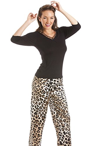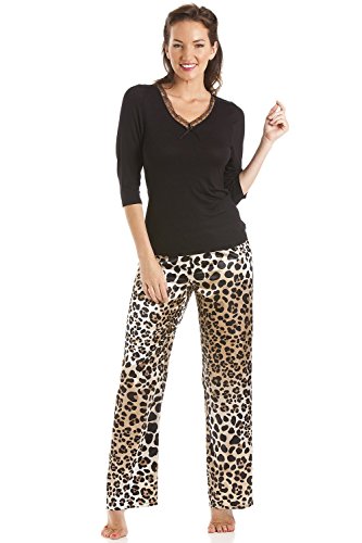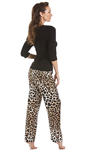 -. Feature : Schwarzes Schlafanzugoberteil aus Viskose und Satinhose mit Leopardenmuster / Das Oberteil verfügt über eine wunderschöne Spitzenverzierung / Erhältlich in den Größen 38, 40, 42, 44, 46 und 48 / Maschinenwaschbar bei 40° C