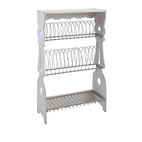 - Rustic style Wood plate rack features three storage tiers and a weathered white finish