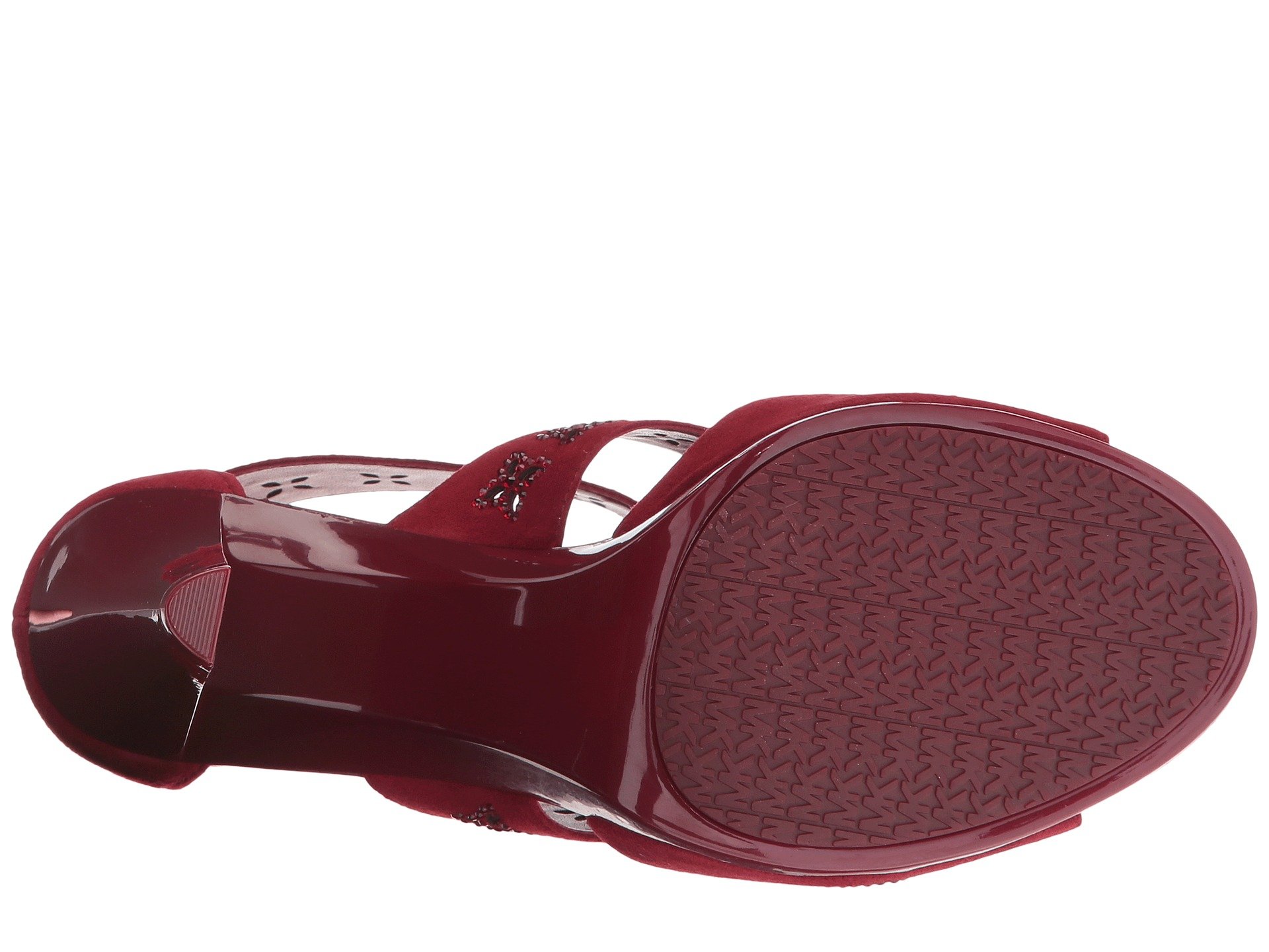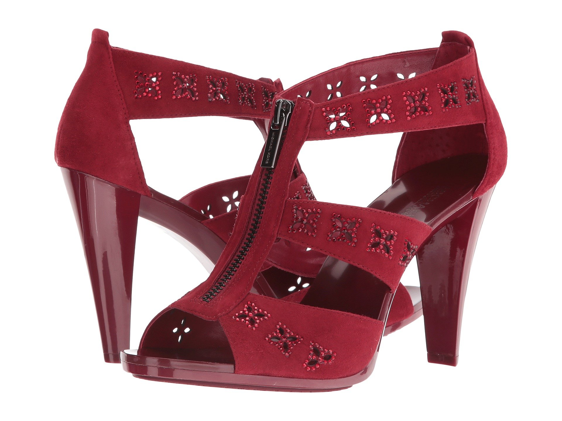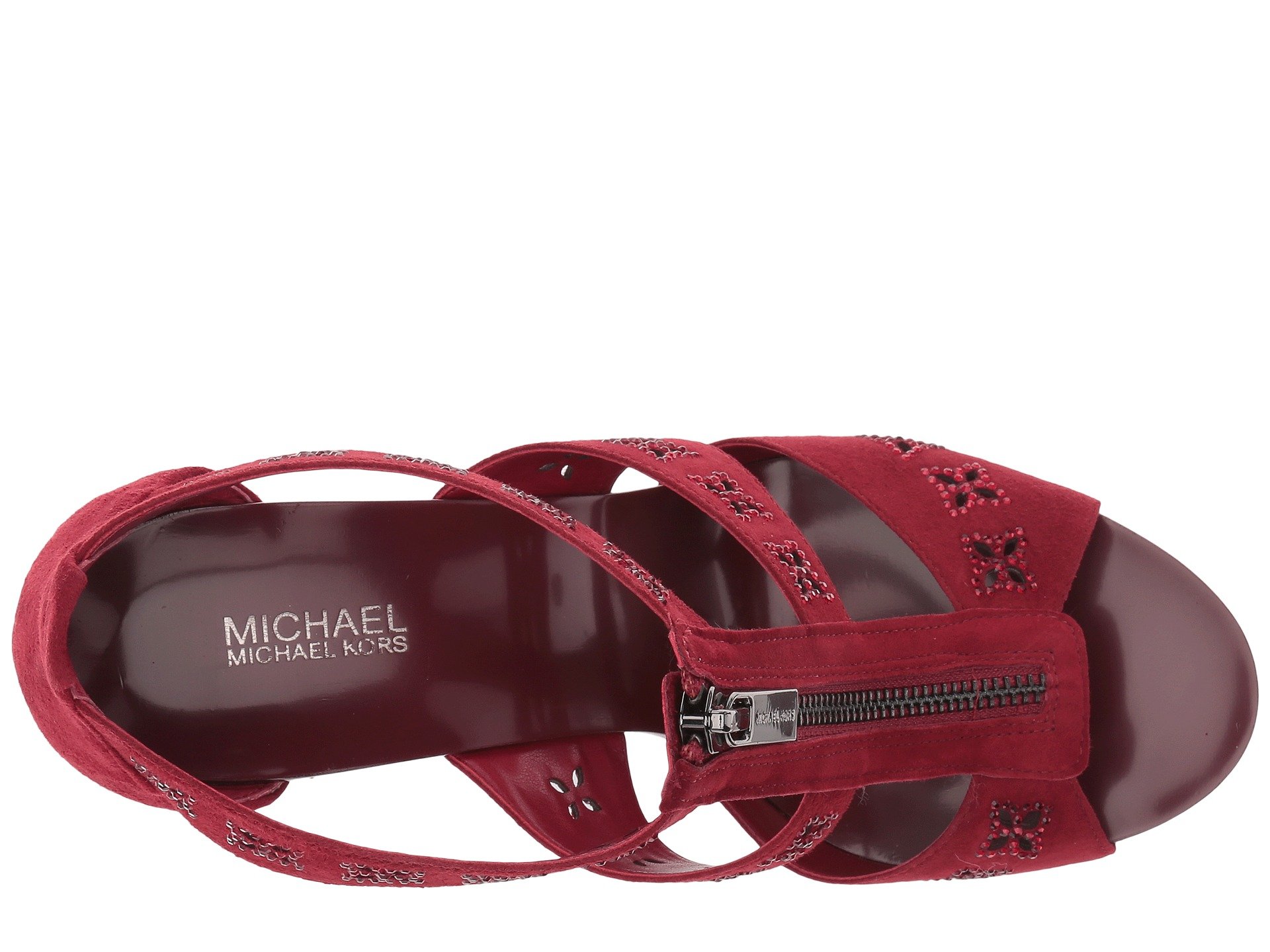| Product Information SKU: #8813605Be sassy and sweet in the MICHAEL Michael Kors? Berkley Floral T-Strap sandal.Suede upper with floral cutout detailing.Front zippered closure.Open toe.Jeweled embellishments throughout.Synthetic lining.Lightly padded footbed.Covered heel.Rubber outsole.Imported.Product measurements were taken using size 7.5, width M. Please note that measurements may vary by size.Weight of footwear is based on a single item, not a pair.Measurements: Heel Height: 3 3?4 in Weight: 9 oz |