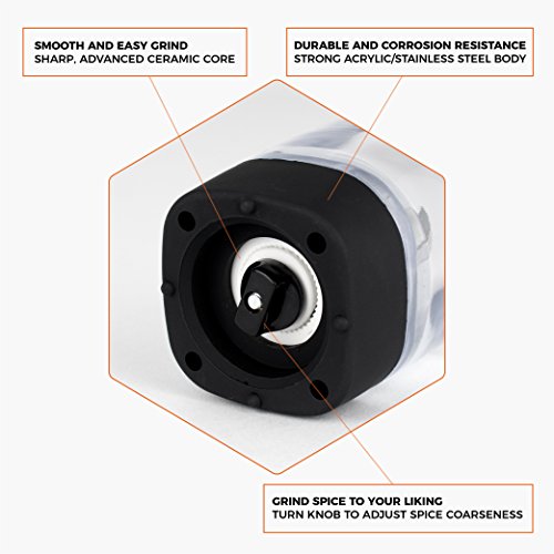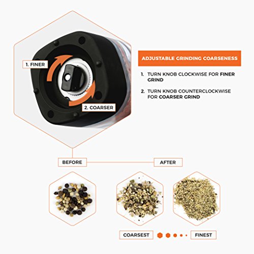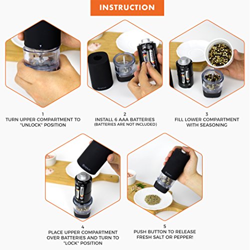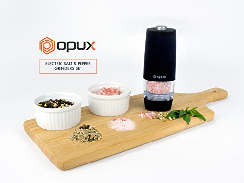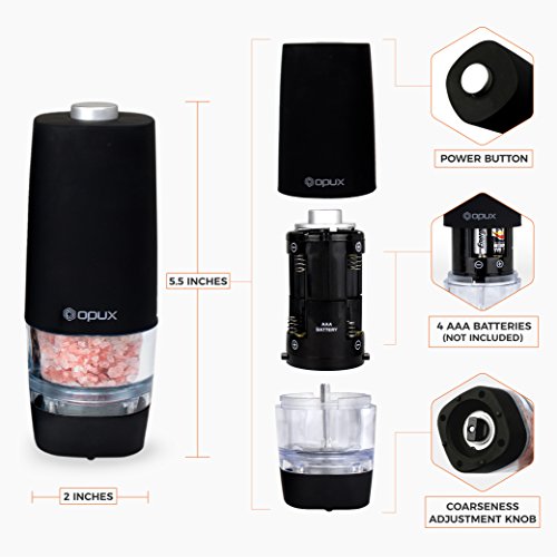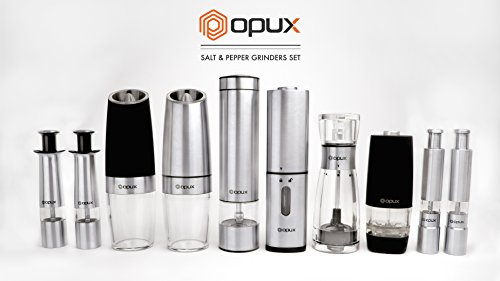 Studio : OPUX Publisher : OPUX Product Description Premium Electric Salt and Pepper Grinder Set by OPUX ? This Premium Electric Gravity Style Salt and Pepper grinder set by OPUX is perfect to use while cooking inside your kitchen or grilling outside in your backyard! ? This Premium Electric Salt and Pepper Grinder Set by OPUX is durable with a sharp, efficient grind. ? With its automatic one touch operation, the Salt Pepper Grinder Set is simple to use and practical. ? With its ability to adjust spice coarseness, it will enhance your cooking experience with better accuracy. ? An instruction manual is included with this Electric Salt and Pepper Grinder Set by OPUX. This Premium Electric Gravity Style Salt and Pepper requires 4 AAA batteries (not included). ? Our Premium Electric Salt and Pepper Grinders measure at 5.5" tall, 2" wide. OPUX creates quality products for your many lifestyles. Our Vision To provide premium kitchen and wine products that greatly simplifies your life. We will continue to innovate and bring exciting products to market so you can achieve more in life! Our Products At OPUX, we offer an extensive line of kitchen tools (such as salt pepper mills), lunch bags, and wine bags/accessories made of highest quality for all occasions. Our products are meticulously designed with materials and functions that truly simplify your life so you can focus on creating your favorite meals or entertaining your guests. 0