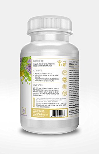 Product features The most complete Fertility support product with 10+ reproductive factors Voted the most trusted brand in fertility support by doctors and clinicians Proven in published clinical trials to be highly effective in improving ovulation and fertilization 100% organic, allergen-free, gluten free ingredients Helps increase the quality of eggs and promote regular menstrual cycles Utilizes Pharmaceutical grade Vitamin B, D, E complex Including organic, non-GMO herbal blend to maximize hormonal balance, egg quality and uterus lining Made in USA in FDA-approved cGMP facility Certified non-GMO, gluten-free Ingredients Per serving: L-Arginine, L-Carnitine, Chasteberry (Vitex agnus-castes)- standardized berry extract, Green tea (Camellia sinensis) - standardized leaf extract, Bromelain, Choline, Coenzyme Q10, Vitamin A (as Beta Carotene from Organic Food Blend), Vitamin C (as Ascorbic Acid from Organic Amla Berry), Vitamin E (as d-alpha Tocopheryl Succinate), Vitamin B-1 (as Thiamin Mononitrate from Organic Guava), Riboflavin (Vitamin B-2 from Organic Guava), Vitamin B-6 (as Pyridoxine from Organic Holy Basil), Folate (from Organic Lemon), Vitamin B-12 (as Methylcobalamin from Organic Chlorella), Biotin (from Organic Sesbania grandiflora), Iron (from Organic Murraya koenigii), Magnesium (from Organic Lantana camara), Zinc (from Organic Guava), Selenium (from Organic Guava)