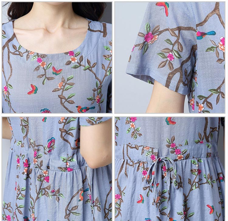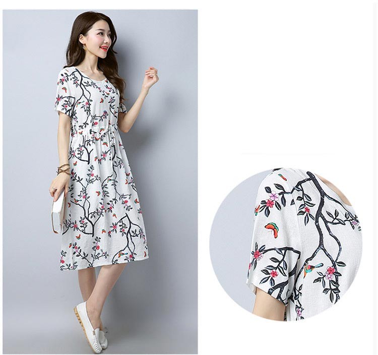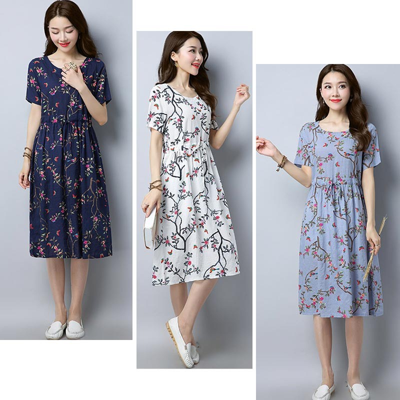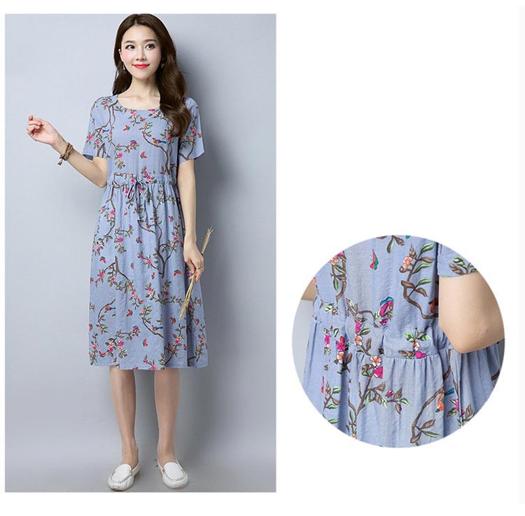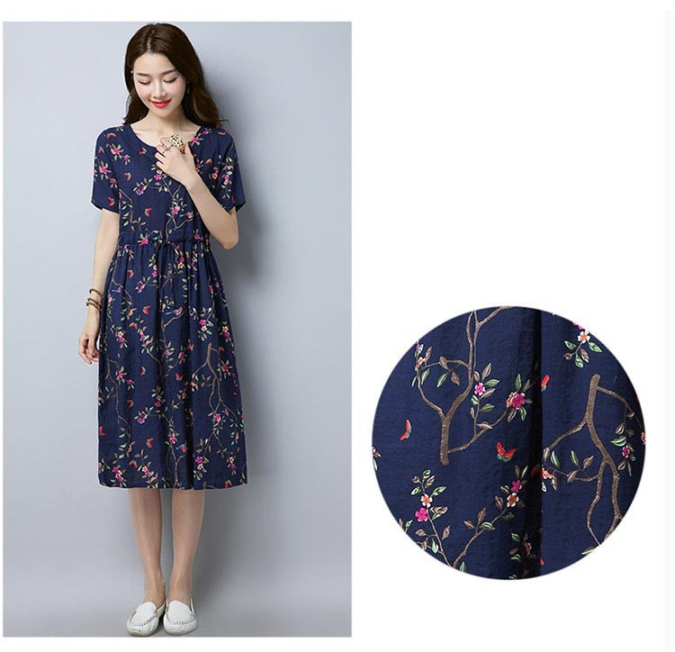 クラシカルな花枝・蝶・鳥のプリント柄ラウンドネック半袖ワンピース♪