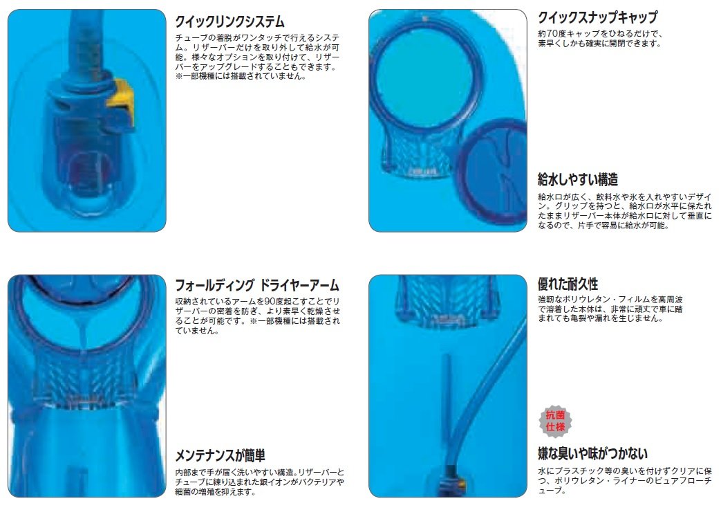 Large openings that are easy to supply water Professional riders who use from players to the military Liza - Banktank "Big bite valve" "Baffle (bulkhead)" contributing to ease of drinking High stability even while driving "Hikari link system" removed hose