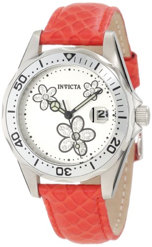 -. Title : Invicta Women's 12513 Pro-Diver Silver Dial Crystal Accented Flowers Red Leather Watch