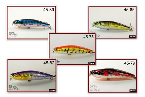 -. Binding : Sports -. Brand : Akuna -. Feature : Color Selection / Wobble Action / Walk the Dog Stickbait / Exceptional colors and body effects / Great Gift Idea -. Label : Blue Penn Solutions, LLC -. Manufacturer : Blue Penn Solutions, LLC -. Model : BP-5-FLA-45-A-P -. MPN : 5FLA45 -. PackageQuantity : 5 -. PartNumber : 5FLA45 -. ProductGroup : Sports -. ProductTypeName : SPORTING_GOODS -. Publisher : Blue Penn Solutions, LLC -. Studio : Blue Penn Solutions, LLC -. Title : Akuna Pack of 5 Ratt'l Top Series 4 inch Topwater Walk The Dog Fishing Lure