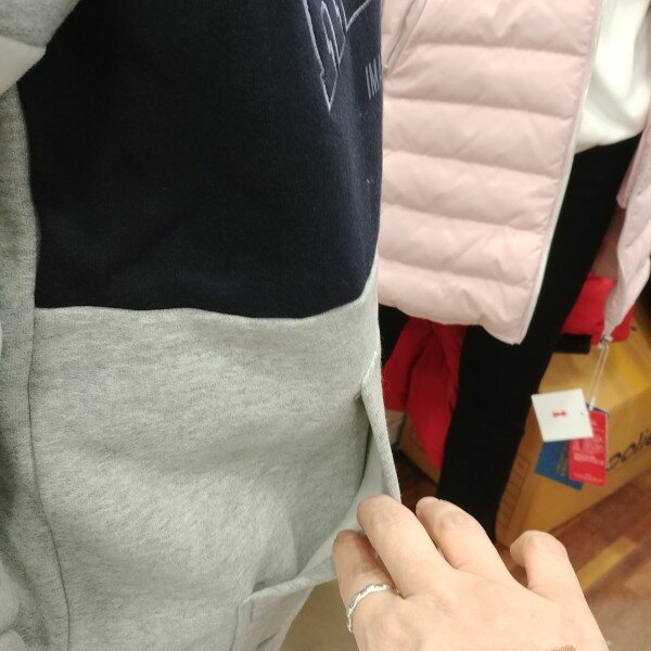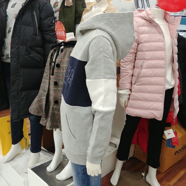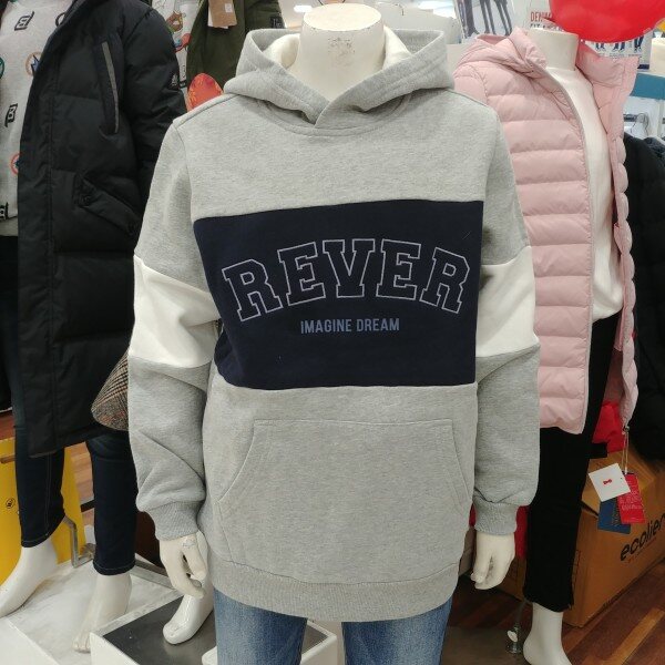 기모가 있는 살짝 도톰한 후드 티셔츠입니다.밝은 그레이 바탕에 네이비 줄무늬의 로고가 돋보입니다.