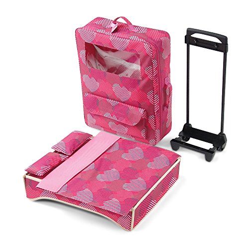 Your 18" doll can travel anywhere and sleep in comfort with this complete travel / doll carrier luggage set. The durable pink travel case has a perfect window to display your doll and includes 2 straps, one to secure your doll in the bed and one to secure the bed in the case, along with multiple compartments to store extra clothes and accessories. The carrier is designed with a removable wheeled trolley and backpack straps to provide several comfortable ways to transport your doll. When you reach your destination, a cute pink doll bed and matching bedding (pillow and blanket) can be removed to provide a restful place for your doll to spend the night! *Doll Not Included*Feature