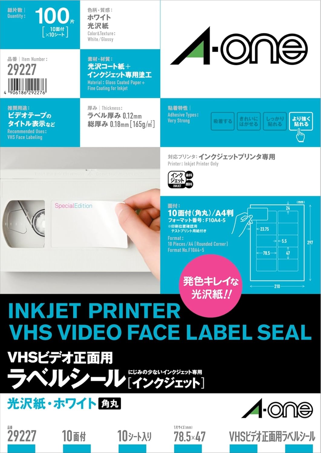 光沢紙・ホワイト/材質:光沢コート紙/標準総厚み:165.0g/㎡(0.18mm)/ラベル厚み:0.12mm A4 10面 四辺余白付 角丸/シートサイズ:A4判 (210mm×297mm)/ラベルサイズ:78.5mm×47mm(2列×5段) 対応プリンタ:インクジェット(染料・顔料)