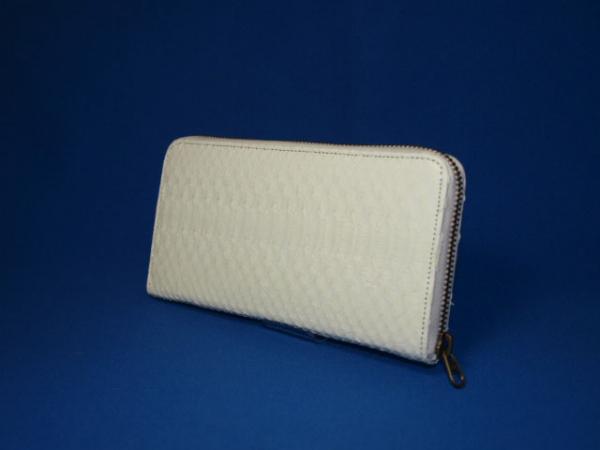 錦ヘビ白マット革で作たラウンドタイプの財布です。ファスナー開閉で簡単に開け閉めができます。カード入れ、小銭入れ、札入れとも収納力のある財布です。白蛇は大変縁起が良いとされ、特に金運、恋愛運等の縁起物として用いられる素材です。