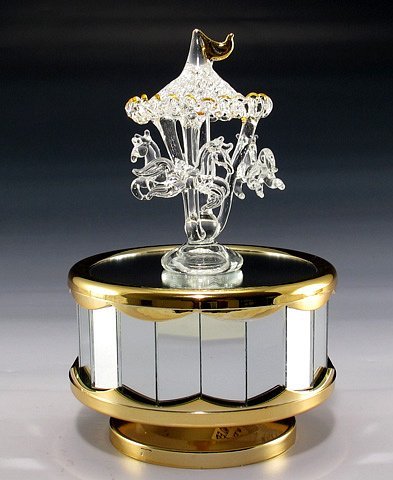 "Carousel Waltz" Music Box: 6.25"H, Hand Spun Glass, Rotating Mirrored Pedestal