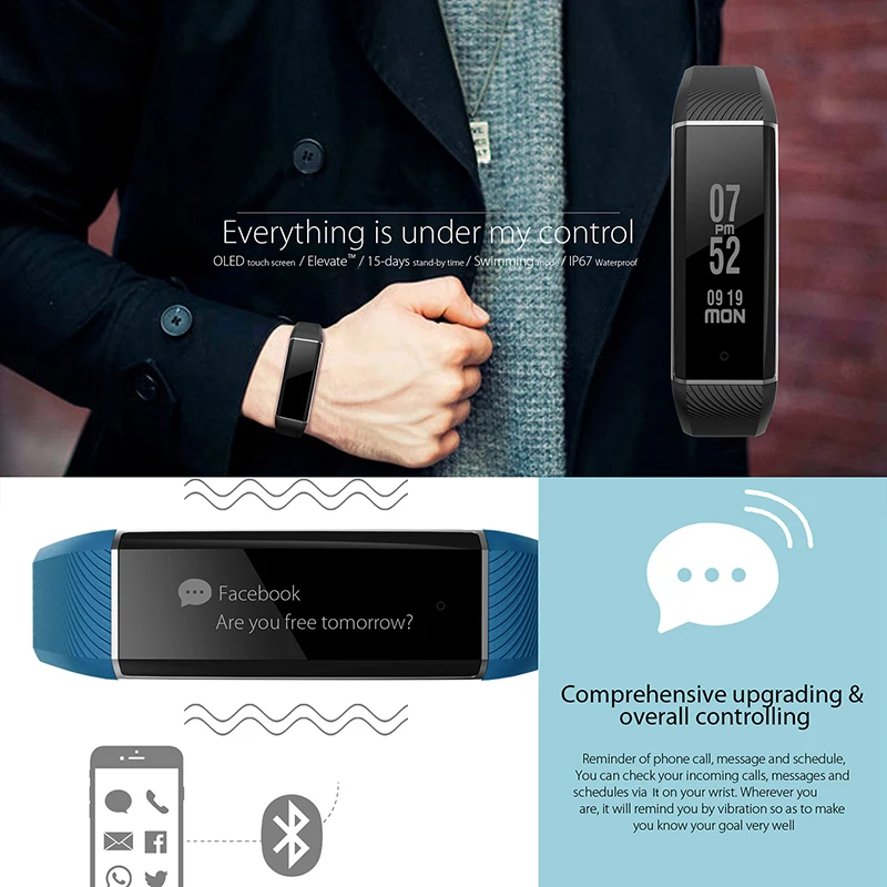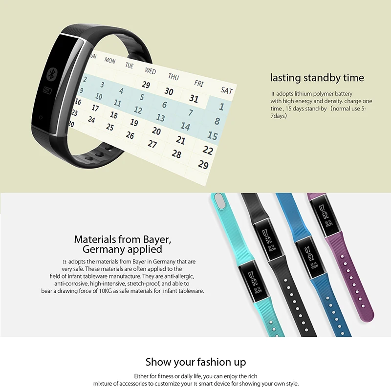- Function:Passometer,Social Media Notifications,Message Reminder,Sleep Tracker,Heart Rate Tracker,Alarm Clock,Call Reminder,Fitness Tracker,Push Message