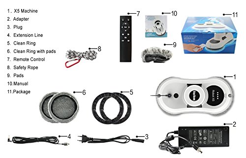 4.About accessories: Clean pads 12 pcs. The pads can be replaceable and washable more than 100 times. Extension cord,4 meters.It's long enough for many house.If it's not enough,it can be extended one by one,4m-8m-12m-16m-20m. Clean liquid,any cleaning liquid can be used together with the robot to clean your windows better.