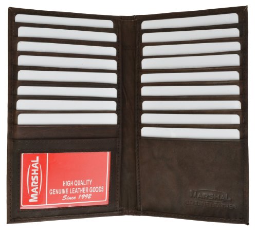 Leather Credit Card Organizational Wallet by Marshal Material is leather Measures 7.1/4" x 4" Pebble grain finish Interior has 19 card slots, 1 ID window, 2 slip pockets This slim organizer is great for keeping everything you need together without the bulk