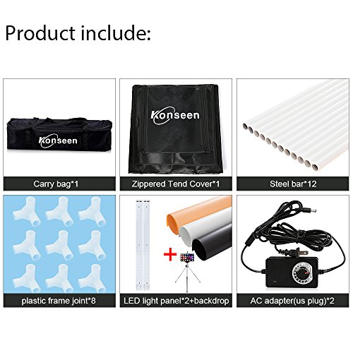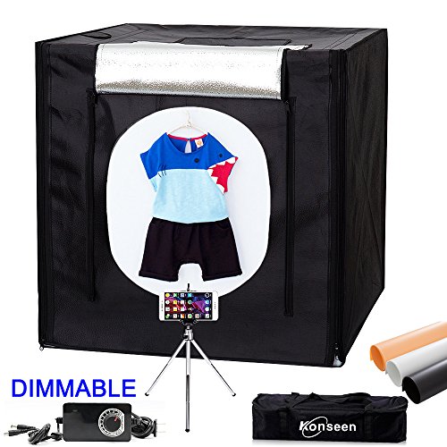Studio : Konseen Publisher : Konseen Product Description Product Name:Dimmable LED Photo Lighting Studio Shooting Tent Kit 32x32 inch (80x80cm) Tabletop Photography Shoot Cube Box with Dimmer,Mini Tripod and 4 Color Backdrops