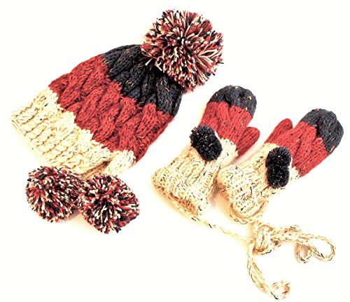 -. Title : ボンボン付ワッチ&ミトンのセット 手編みニット 3色ボーダー ケーブル シロコ風 フリース付ミトン