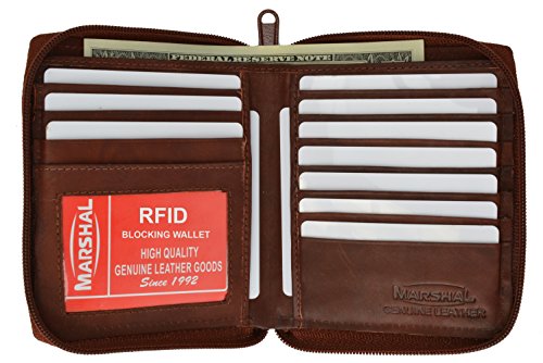 Protect your RFID Credit Cards, Debit Cards, ID Cards from electronic pickpocketing Men's Bifold Genuine Leather Zippered Wallet 9 Credit Card Slots, ID Window 2 full length currency pockets Measures: 4.3" L X 5" H whcn closed