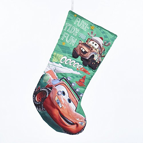 - Bring the thrill of the race track to any holiday decor with this Disney® Cars 3 Printed Stocking from Kurt Adler. This 18-inch green stocking features the beloved Lightening McQueen and his best friend Mater and a race track pattern in the background! Includes un, festive touches such as glittery gold stars, Christmas lights around an orange safety cone and Mater, and "Fuel-tide fun". Perfect for any Disney® fans or collectors!