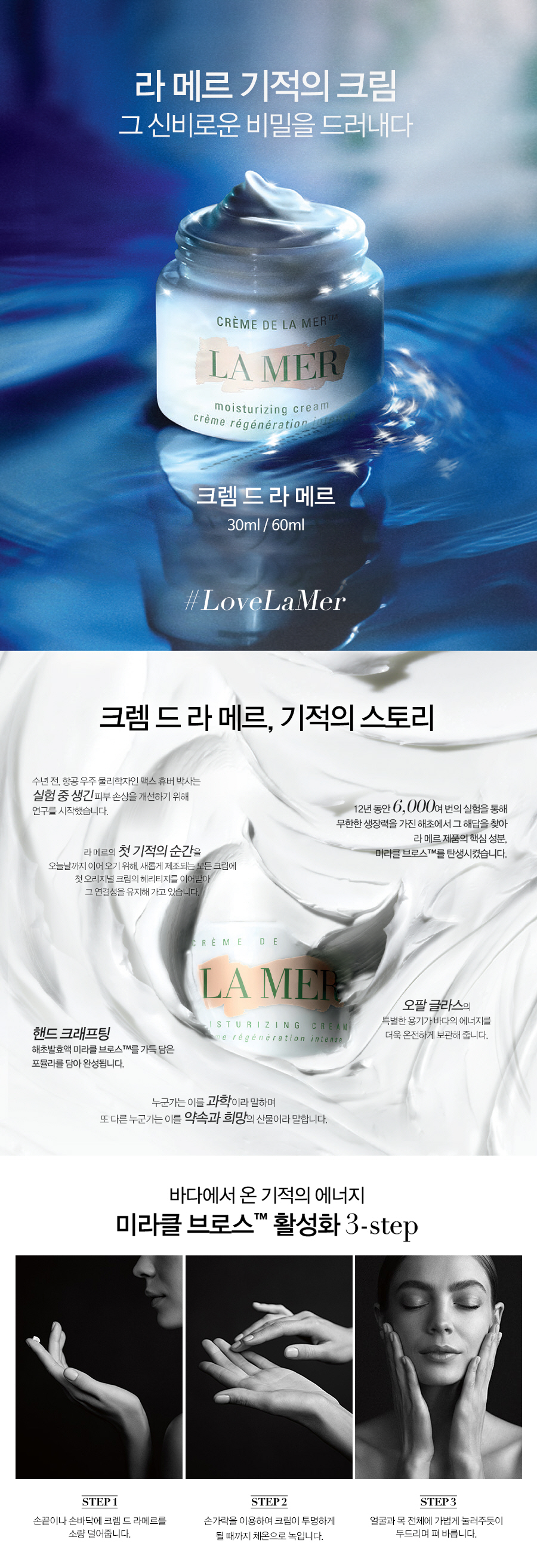 크렘 드 라 메르 바다에서부터 전해지는 전설의 크렘 드 라 메르는 피부에 변화를 줍니다. 피부는 부드러워지고 탄력과 피부결 개선에 도움을 주며 더욱 건강한 피부로 유지시켜 줍니다. [비밀] 라 메르의 미라클 브로스(Miracle Broth) 성분을 잘 침투되게 하려면 크림을 진주알 크기만큼 떠서 두 손가락 끝으로 문질러 따뜻하게 녹이십시오. 세안 후 물기를 닦아 낸 피부에 크림을 가볍게 톡톡 두드려 바르십시오. 사용과 함께 브로스의 풍부한 보습을 느끼실 수 있을 것입니다. 얼굴, 목 또는 민감한 눈 주위도 부드럽게 두드려 발라 주십시오.