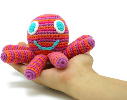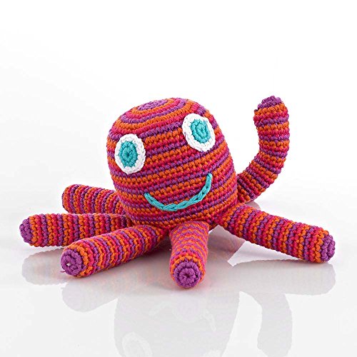 This crochet octopus rattle was the first product Samantha Morshed designed when she decided to launch the Pebble brand. Remembering how her little ones had always liked rattles that you could both grab and chew at the same time, the octopus seemed a perfect match with its eight long legs. It's proved a huge hit and we are proud to be able to continue offering this product. At Pebble they like to think that their toys spread smiles worldwide: the ladies who make them in Bangladesh smile because the toys bring them work, the parents smile because the toys keep their babies happy and enable them to shop with a conscience and the babies smile - well you can see why! We hope you love this little rattle as much as we do. All Pebble products are made in Bangladesh by the extremely talented and capable artisans at Hathay Bunano ps. We love their workmanship and we love rural Bangladesh. Pebble toys are our small contribution to supporting families in rural Bangladesh, to removing the need for economic migration to the cities and to providing women with flexible working opportunities which are close to their homes. All Pebble toys are 100% cotton with 100% polyester fill. About 15cm. They are all machine washable and can be tumble dried on a low setting.Feature