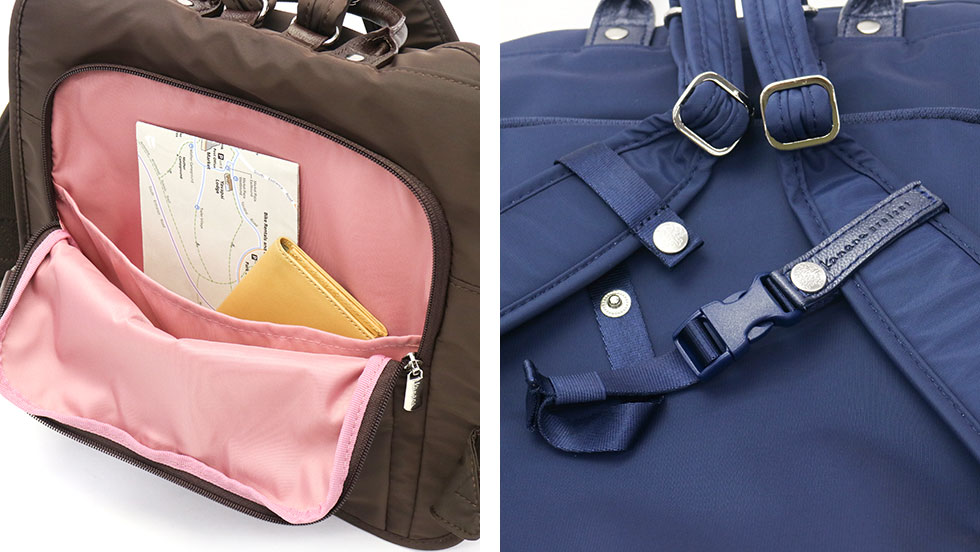Snap removable chest strap can be removed and stored in a pocket in the back pocket close to the body, it has become a design that raises security even at train movements while carrying on the back.