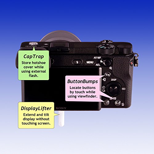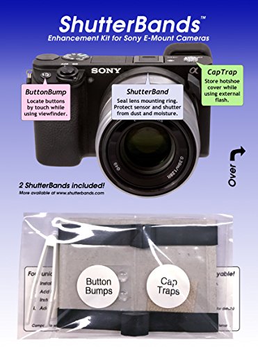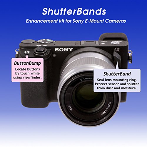 Improve the handling of your Sony E-Mount camera with the four exclusive enhancements in our ShutterBands Kit. ShutterBands are like rubber bands made of synthetic rubber and tailored to fit your E-Mount lenses. Install a ShutterBand on each of the lenses in your kit. With an easy-to-grab tab, you can move the band over the lens mounting ring and snug it up to the camera body to seal out dust and moisture. Essential protection for your sensor and shutter when using your camera outdoors! It's a challenge to find the Fn and Custom buttons while using the viewfinder. Install ButtonBumps to remedy that problem. With ButtonBumps, finding any button by touch is easy. Make camera adjustments quickly without fumbling for a button - even in the dark. The articulating LCD display is one of the most useful features on your camera, but it's not so easy to get a finger under it to extend it. Our DisplayLifter provides an inconspicuous tab that you can pull to tilt the display from its stowed position. Especially helpful when your camera is mounted on a tripod. Stop worrying about where to put the hot shoe cover while using your external flash with CapTraps. Install a CapTrap disk on your camera hot shoe cover and another on your camera body and you'll always have a safe place to stow your hot shoe cover. Just snap it on. A second set of CapTraps is provided for your external flash. Also included in our kit is a pair of tweezers to help with the ButtonBump installation, a template to assist in centering the DisplayLifter, and an alcohol wipe to clean the installation areas on your camera. This ShutterBands Kit is compatible with most Sony E-Mount cameras, including a6000, a6300, a6500, a7r, a7s, and NEX series. Also check out our new ButtonBumps Pro Pak here on Amazon! 0 |