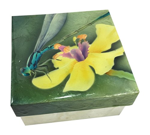 - A yellow flower with a blue dragonfly is painted on the Capiz Shell Trinket Box with a beautiful iridescent effect.