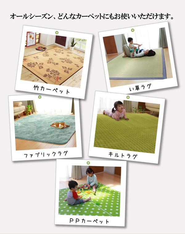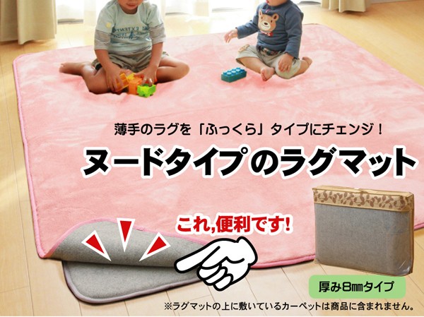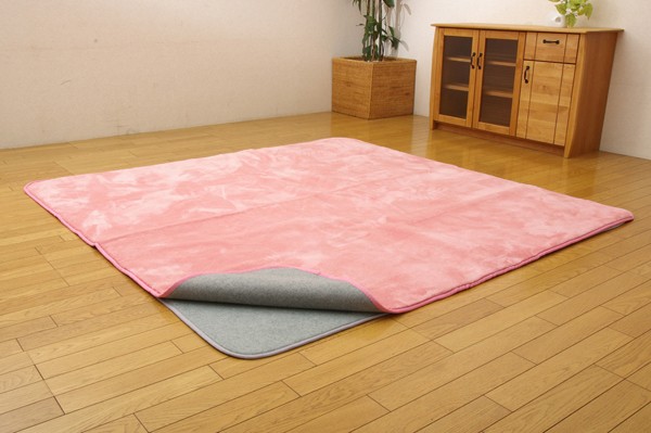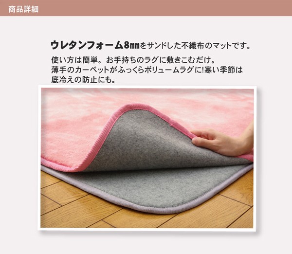 両面不織布のラグマットです。お手持ちのホットカーペットカバーの下に敷くだけで、ボリュームアップできる商品です。フローリングの上でのご使用にピッタリです。中材の厚みが8mmで適度なクッション性があります。厚みがあるので冬には底冷えがしにくく、また裏にはすべりにくい加工を施しております。小さなお子様がいらっしゃるので頻繁に洗濯される方、薄手のキルトラグをご使用の方、ボリュームタイプがいいけど、洗いたいという方にお勧めの商品です。※本商品は30℃以下の水温での弱い手洗いをお勧めします。