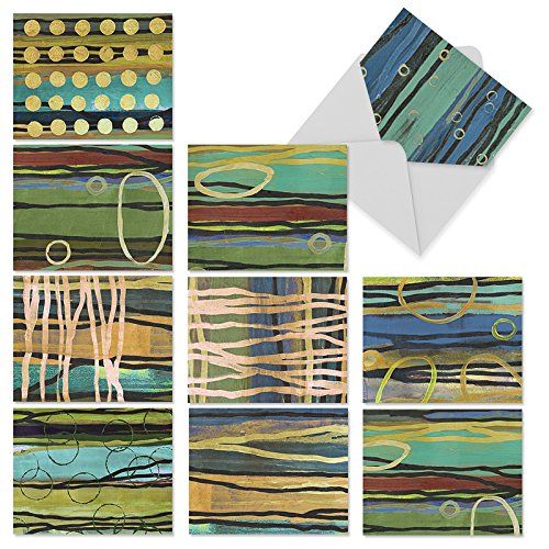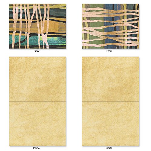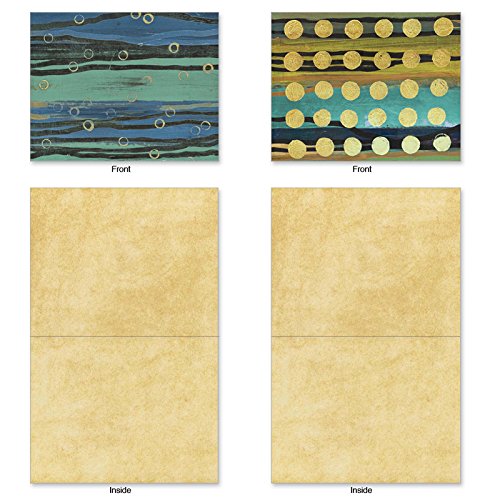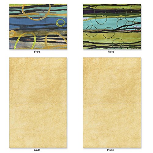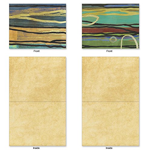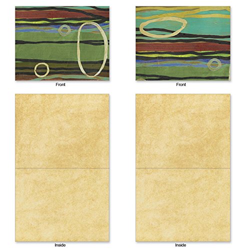 Horizontal strokes of earthy colors are overlaid with creamy stripes and bubbles that create abstract dreamscapes on these Blank Note Cards appropriate for sharing your dreams, family news, invitations and thank yous with others in the form of a handwritten note. These notecards look great framed, too! Try framing them individually, or grouping several in a collage frame, to create visually appealing wall decor.
