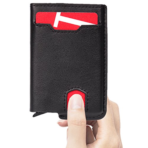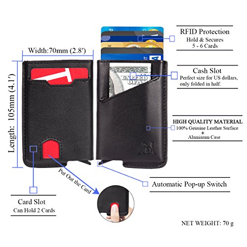 Highlights - RFID BLOCKING prevents cards from being copied; superb birthday, holiday or wedding gifts. - HIGH QUALITY MATERIAL: 100% Genuine Leather Surface (Softer, more Breathable and Glossier), Sturdy and Perfect Size Aluminum Case , No breaking, No bending. - Perfect men's wallet, slim credit card holder, small and convenient to use, easy to keep it in your back pocket. - All cards slide out gradually with the automatic pop-up switch, stops the cards from damaging and falling out. Technical specifications(approx) - Main Meterial: Aluminum - Measures: 10 X 6.5 X 1.3cm(3.94" X 2.6" X 0.51") - Capacity: Can hold 5 pcs Credit Cards Package Included: 1* Card Holder 0 |