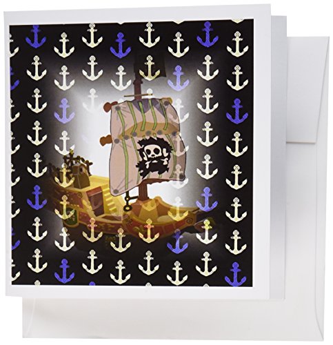 3dRose Pirate Ship On Blue n Bone Anchors - Greeting Cards, 6 x 6 inches, set of 12 (gc_123207_2)