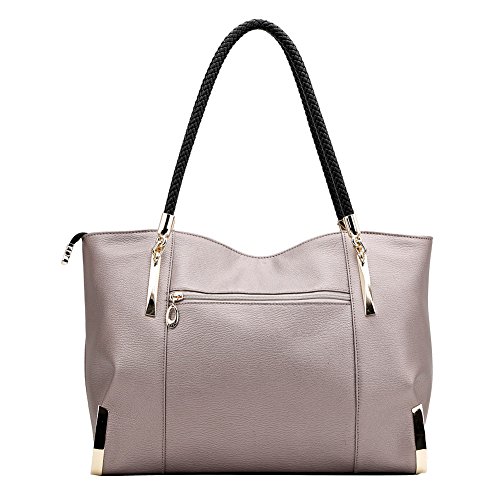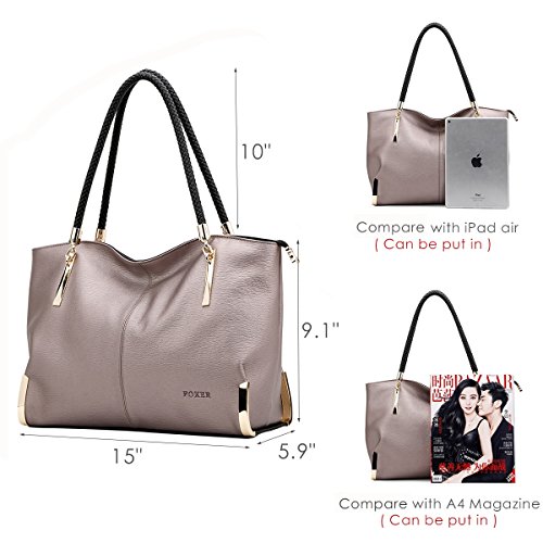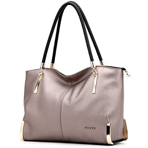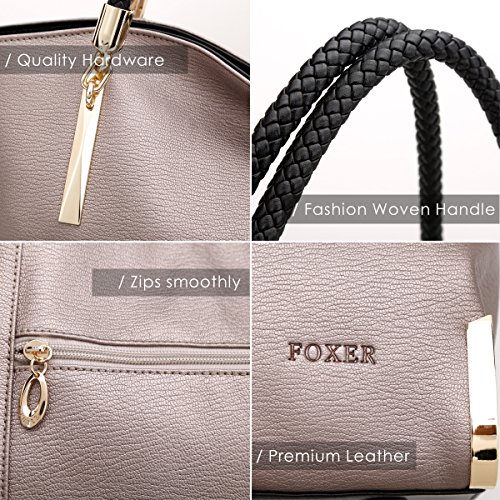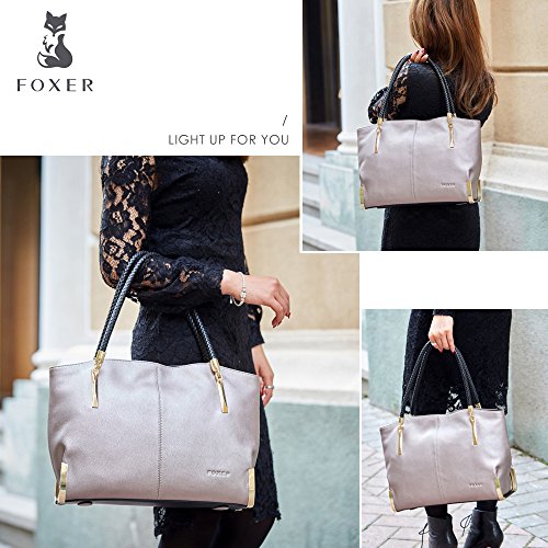Product Description FOXER - LIGHT UP FOR YOU Material: Split leather ( cowhide leather), polyester silk lining Dimensions: 15" L x 5.9" W x 9.1" H Handle Length: 10" Color: Black, Gray Structure: 2 main compartments, 1 zipper compartment, 1 side zipper pocket, 1 phone pocket, 1 card pocket and 1 back zipper pocket. About Us FOXER was found in 2000, all products created by top designers from Italy. FOXER has been focused on creating beautiful, fashion and suitable products for consumer from its inception, and become a brand leader in high quality leather bags is FOXER eternal pursuit. Warm Prompt: 1. Due to different measurement methods, there may be deviation of 0.4 - 1 inches for item 2. Colors may differ slightly from actual colors depending on your monitor, cellphone settings, different camera or light environment. 3. There might be a little smell as you get the new product, it is normal and the smell would disappear in a few days. Care Tips: 1. Keep away from oil, humidity, heat source and sharp instrument. Avoid exposure to chemicals, spikes and heat. Clean it with dry soft cloth when got stains. 2. In order to prevent your leather from fading, please avoid storing it in direct sunlight. 3. Do not dry leather in direct heat when wet. Leave it to dry naturally. 4. When you don't use your leather product for a long time, please store it in a breathable bag rather than a plastic one to avoid a build up of humidity, as the leather product can get mildewed. 0