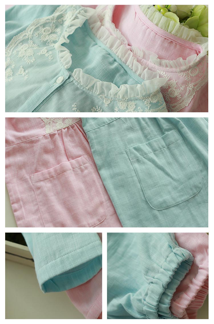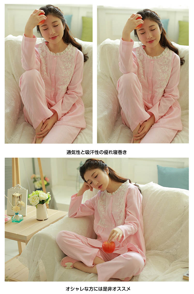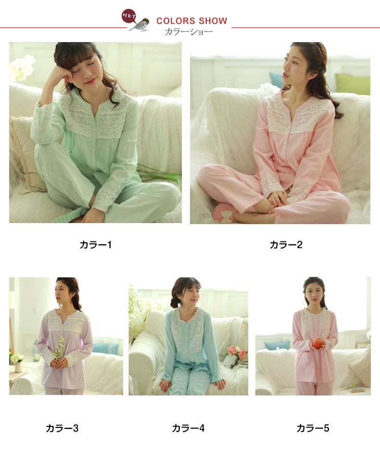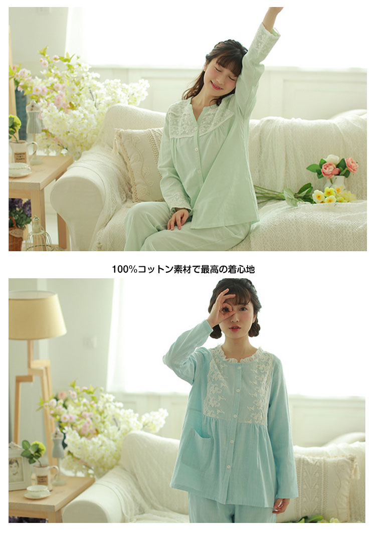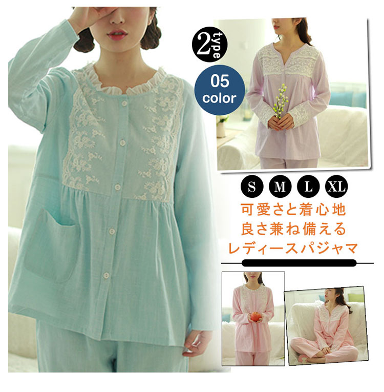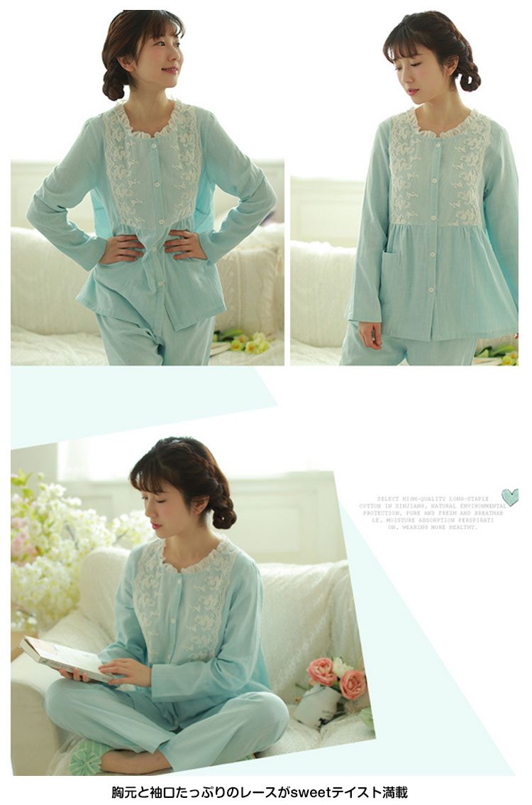 | 可愛さと着心地良さ兼ね備えるレディースパジャマ100%コットン素材で最高の着心地胸元と袖口たっぷりのレースがsweetテイスト満載通気性と吸汗性の優れ寝巻きオシャレな方には是非オススメ | |